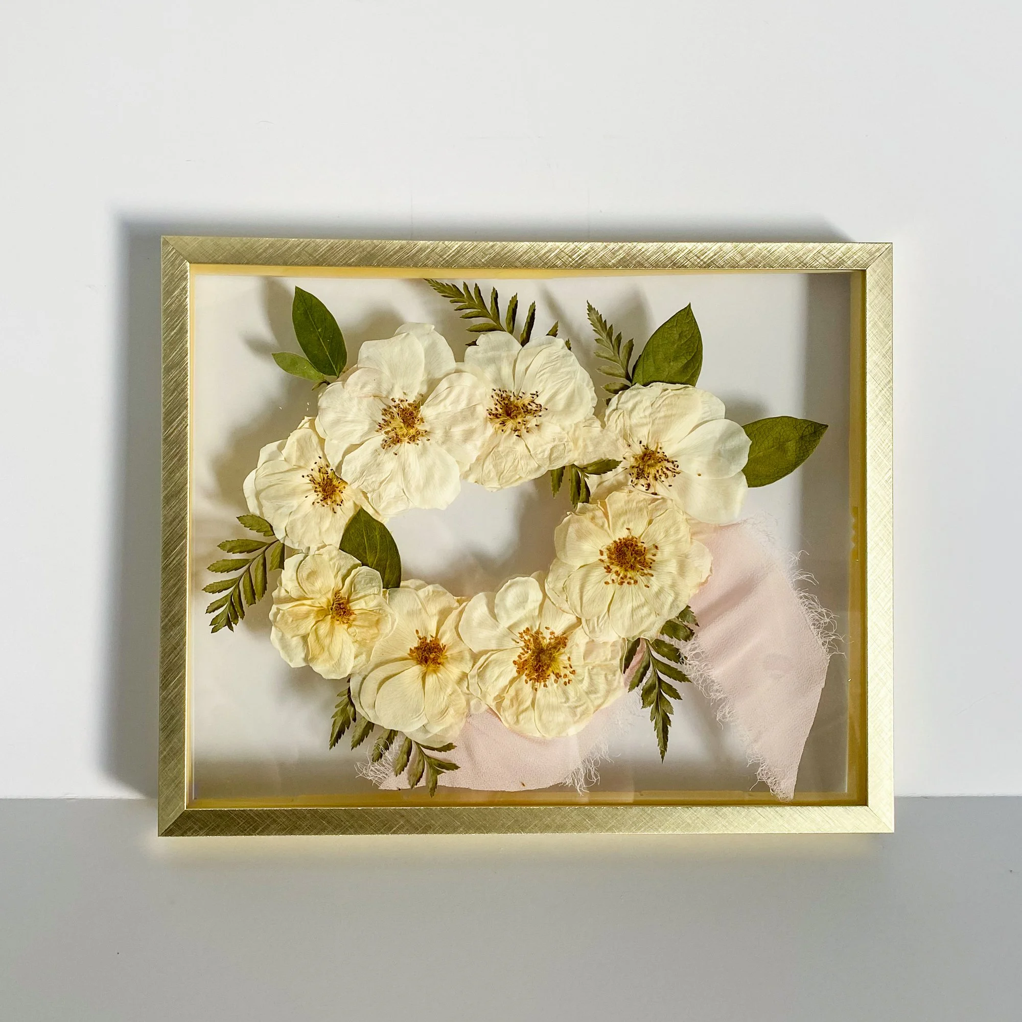 8” x 10” pressed flower crown frame with bridal flower crown and ribbon.