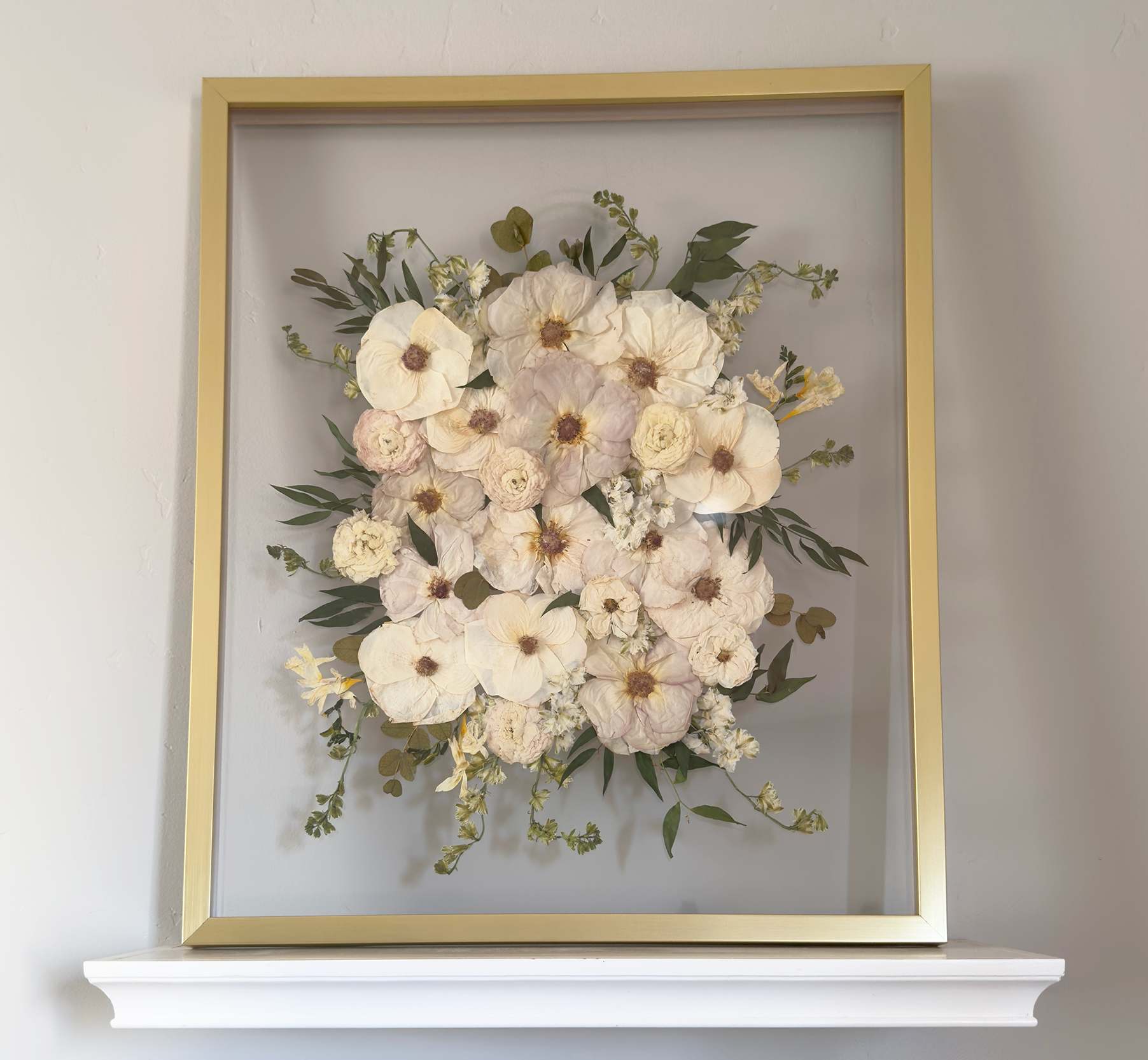 Spacers sit between the glass and your flowers, giving them room to breathe and preventing compression. They’re invisible from the front, but essential.